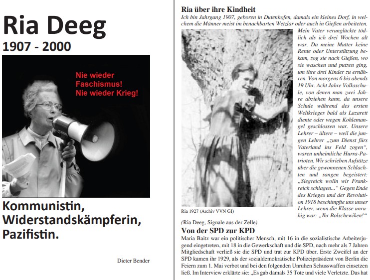 Die Neuausgabe enthält Rias Bericht über ihren antifaschistischen Widerstand, zahlreiche Würdigungen und weitere Texte. Diese Ausgabe soll zusätzlich die Diskussion um die Aufstellung einer Stele zur Ehrung von Ria an prominenter Stelle befeuern. Ria Deeg – Signale aus der Zelle; November 2020; Hrsg.: DKP Gießen und VVN-BdA Gießen. Preis: 5,- Euro zzgl. Versand; Bestellung per Email: giessen@dkp.de Leseprobe